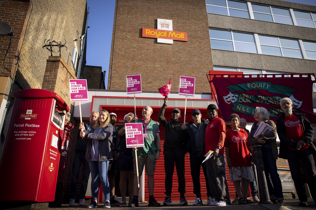 epa10139443 Royal Mail staff join a Communication Workers Union (CWU) strike, outside a post office in London, Britain, 26 August 2022. According to CWU, over 115,000 postal workers are on strike in a dispute over pay, the biggest walkout since 2009. EPA/TOLGA AKMEN