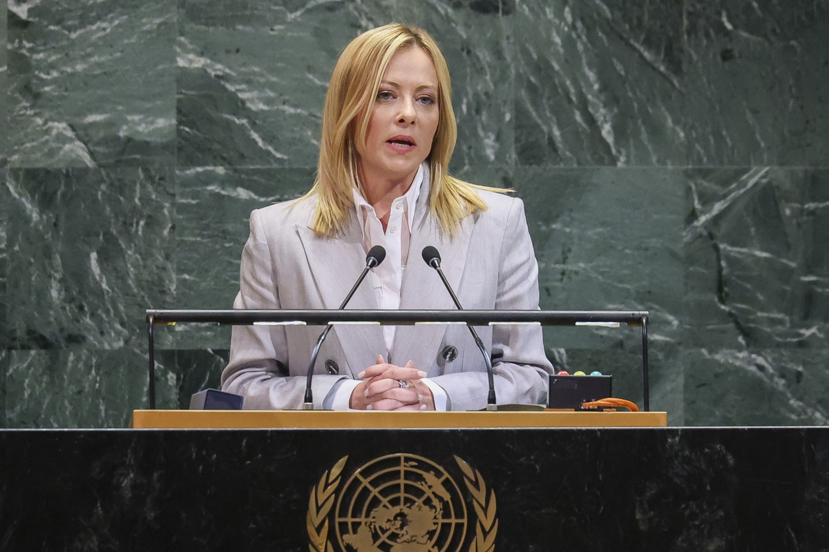 epa12403507 Italian Prime Minister Giorgia Meloni speaks during the General Debate of the 80th session of the United Nations General Assembly (UNGA) at the United Nations headquarters in New York, USA, 24 September 2025. EPA/SARAH YENESEL