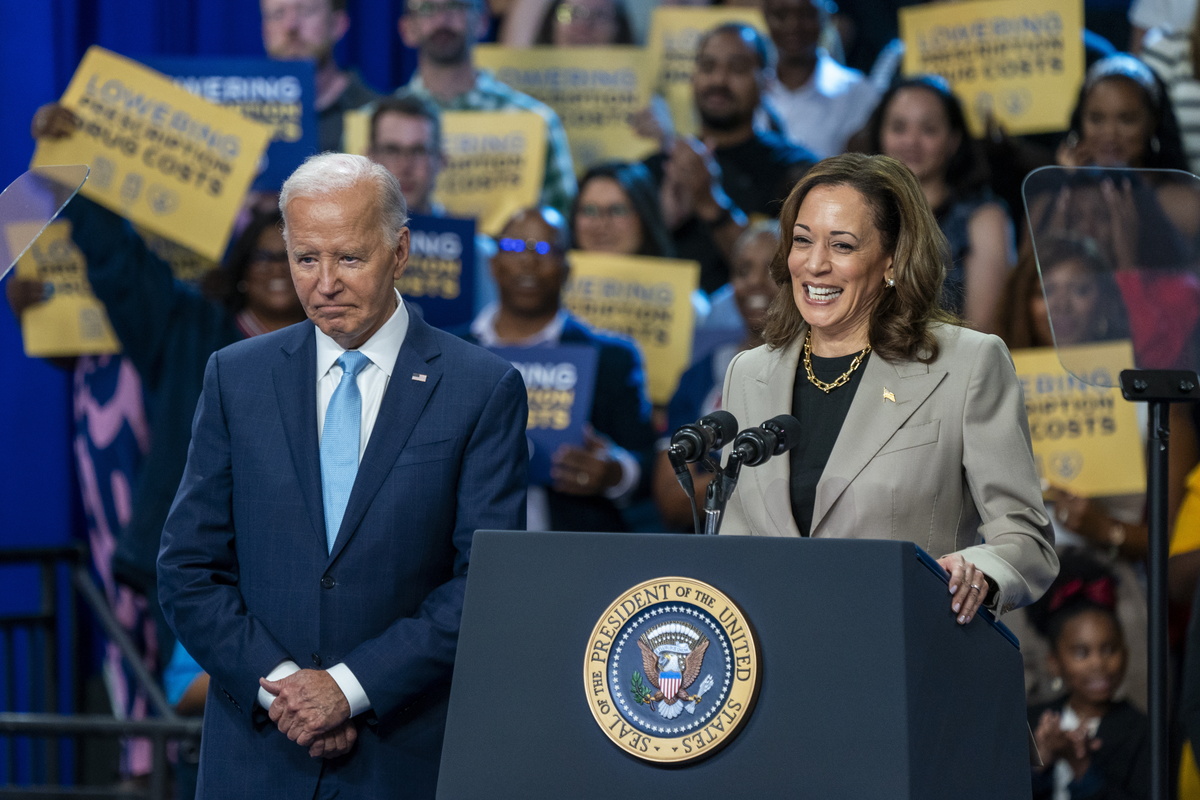 epa11550500 Presumptive Democratic Presidential nominee, Vice President Kamala Harris (R), with US President Joe Biden, delivers remarks on the progress they are making to lower costs for the American people during an event at Prince George's County Community College in Upper Marlboro, Maryland, USA, 15 August 2024. Vice President Harris will deliver remarks on her economic plan during a campaign rally in Raleigh, North Carolina, on 16 August 2024. EPA/SHAWN THEW