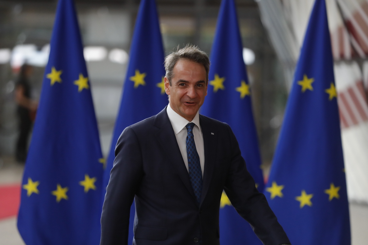 epa10029043 Greece's Prime Minister Kyriakos Mitsotakis speaks to media as he arrives for an EU-Western Balkans leaders' meeting in Brussels, Belgium, 23 June 2022. The progress on EU integration and the challenges which the Western Balkans countries face in connection to the Russian invasion of Ukraine are topping the agenda when EU and Western Balkan leaders meet prior a European Council meeting. EPA/STEPHANIE LECOCQ