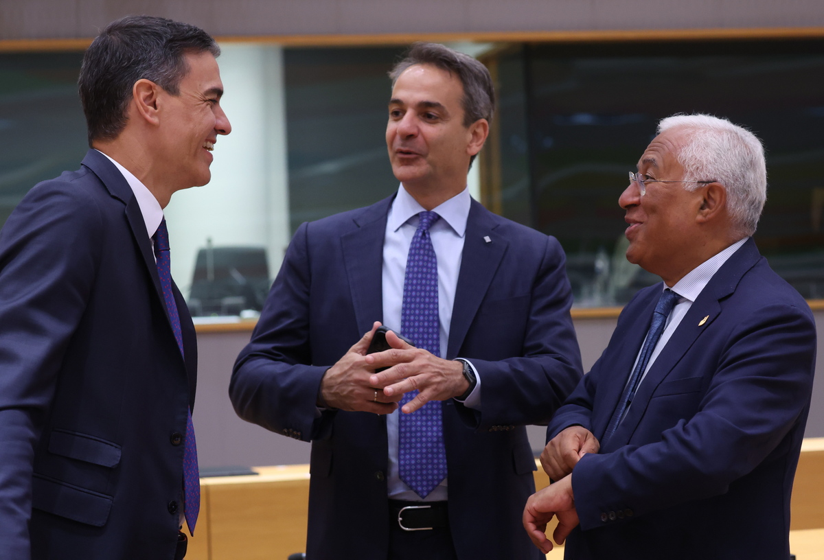 epa10718712 (L-R) Spain's Prime minister Pedro Sanchez, Greece's Prime Minister Kyriakos Mitsotakis and Portugal's Prime Minister Antonio Costa at the second day of a European Council in Brussels, Belgium, 30 June 2023. EU leaders are gathering in Brussels for a two-day summit to discuss the latest developments in relation to Russia's invasion of Ukraine and continued EU support for Ukraine as well as the block's economy, security, migration and external relations, among other topics. EPA/OLIVIER HOSLET