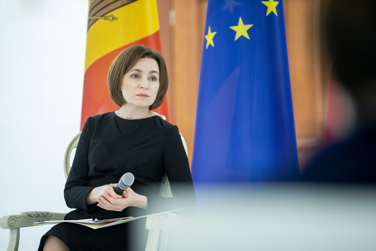 epa09870079 Moldova's President Maia Sandu speaks at a press conference in Presidential Palace in Chisinau, Moldova, 04 April 2022. Sandu talked about the political situation, the support of Moldova's efforts in receiving Ukrainian refugees, how Moldova faces economic crisis and energy crisis. EPA/DUMITRU DORU
