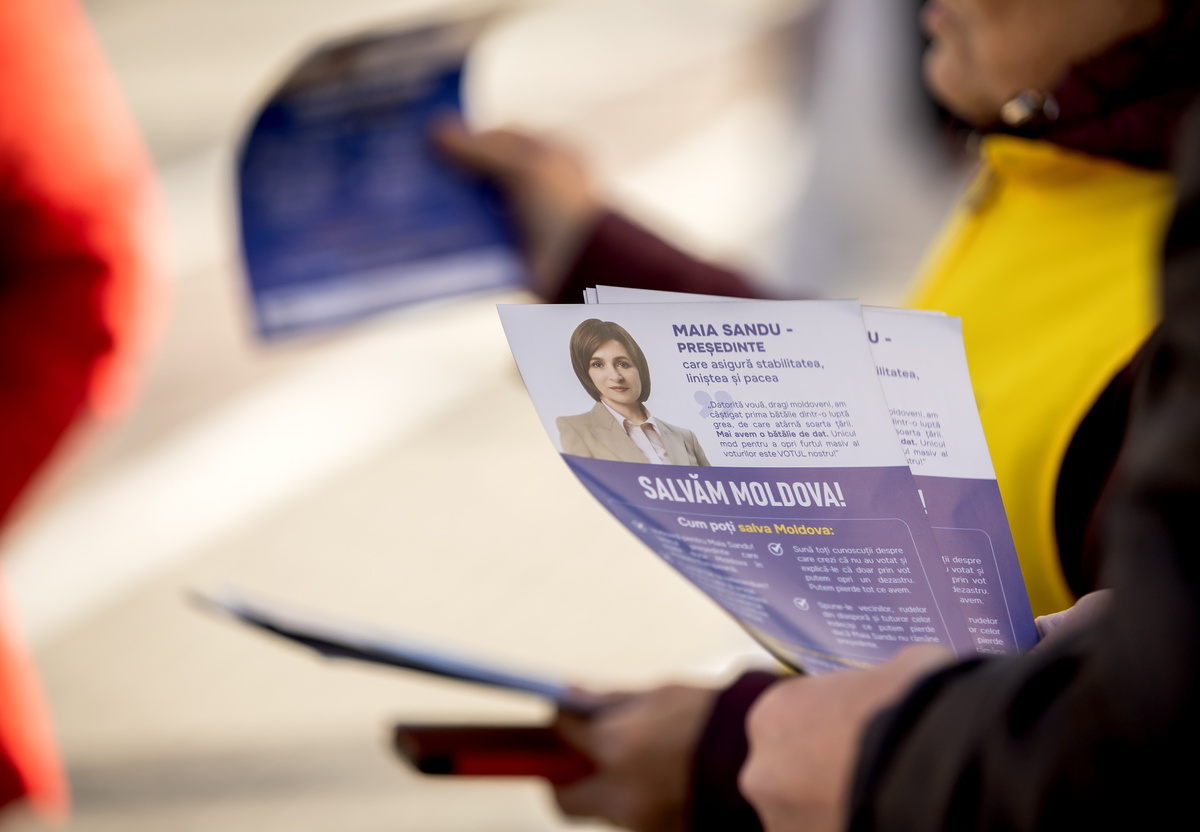 epa11687718 Campaign leaflets of Moldovan President Maia Sandu are shared in front of an electoral tent in downtown Chisinau, Moldova, 27 October 2024. Moldova will hold the second roud of presidential election, between incumbent Moldovan President Maia Sandu and former prosecutor general Alexandr Stoianoglo, on 03 November 2024. EPA/DUMITRU DORU