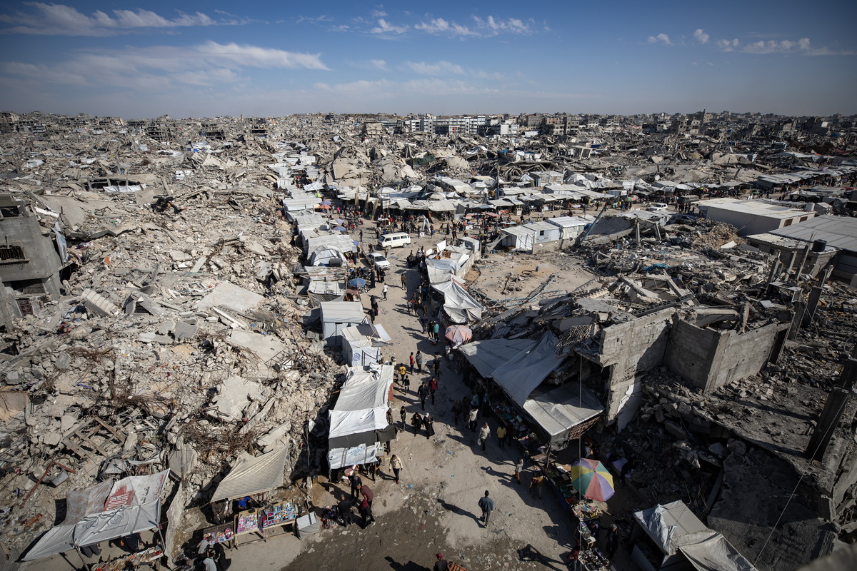 epaselect epa12058916 Displaced Palestinians gather at a market near the rubble of destroyed buildings in Jabalia, northern Gaza Strip, 27 April 2025. The UN World Food Programme (WFP) announced on 25 April it has depleted all food stocks for families in Gaza due to weeks of closed border crossings. Over a million Gazans face 'high levels' of acute food insecurity, with acute malnutrition several times higher than pre-war levels, the UN Palestinian refugee agency UNRWA warned. EPA/HAITHAM IMAD