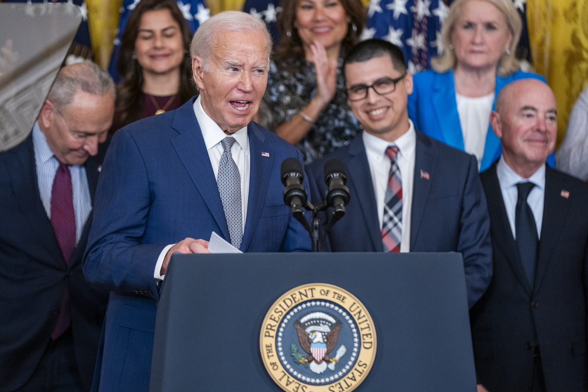 epa11421022 US President Joe Biden delivers remarks during the Deferred Action for Childhood Arrivals (DACA) 12th Anniversary event in the East room of the White House in Washington, DC, USA, 18 June 2024. President Biden announced his administration's program allowing undocumented immigrants married to US citizens to apply for legal residency. EPA/SHAWN THEW / POOL