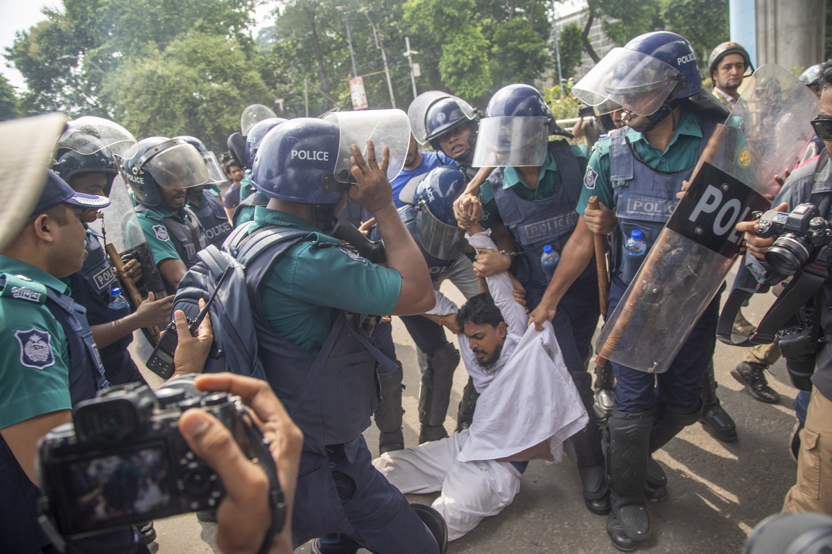 epa11483606 Policemen arrest Akhter Hossain, one of the protesters demanding quota reforms in public service, at Dhaka University campus in Dhaka, Bangladesh, 17 July 2024. Dhaka University authorities have announced an indefinite closure of the institution amid ongoing protests demanding quota reforms in public service, one day after police reported that at least six people died and dozens injured as clashes took place during nationwide protests demanding the abolition of quotas in government jobs. EPA/MONIRUL ALAM