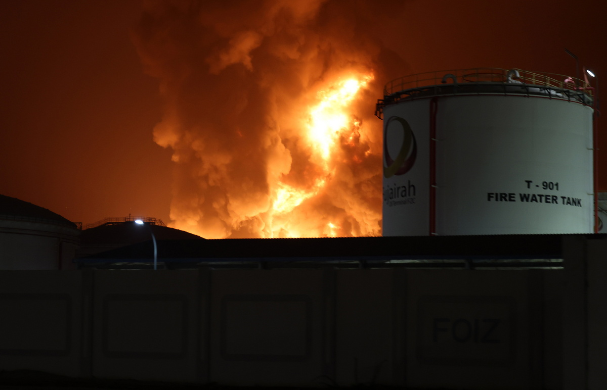 epa12795116 Flames rise during a fire casued by debris from an intercepted drone at the oil refinery hub in Fujeirah, United Arab Emirates, 04 March 2026. Iran continued to launch retaliatory attacks across the region following a joint US-Israeli military operation that started in the early hours of 28 February 2026, targeting multiple locations across Iran. EPA/STRINGER