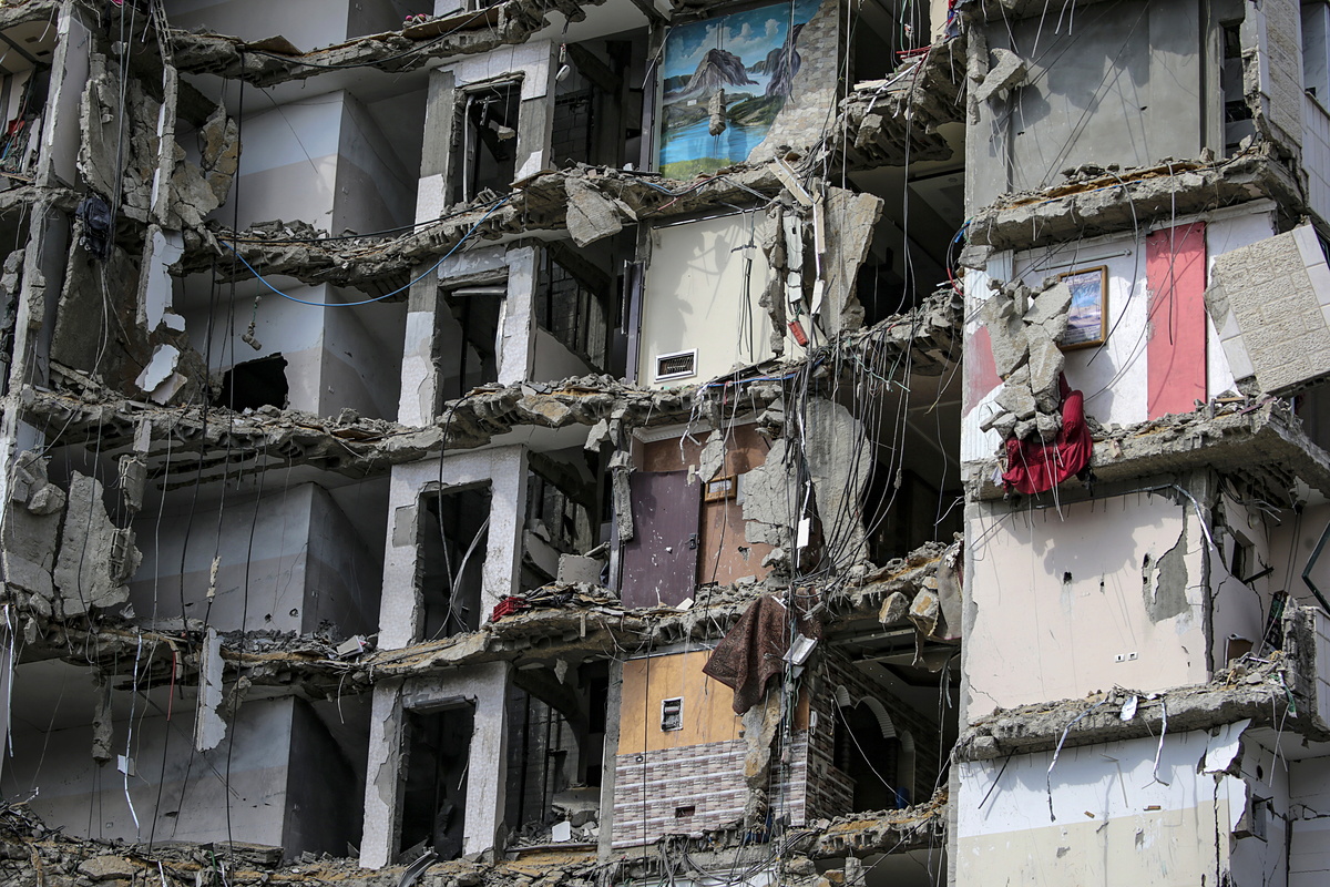 epa10922271 A view of a destroyed building following Israeli strikes in Al Remal, in Gaza City, 16 October 2023. Israel has warned all citizens of the Gaza Strip to move to the south ahead of an expected invasion. More than 2,750 Palestinians and 1,400 Israelis have been killed according to the Israel Defense Forces (IDF) and Palestinian Health Ministry after Hamas militants launched an attack against Israel from the Gaza Strip on 07 October. EPA/MOHAMMED SABER