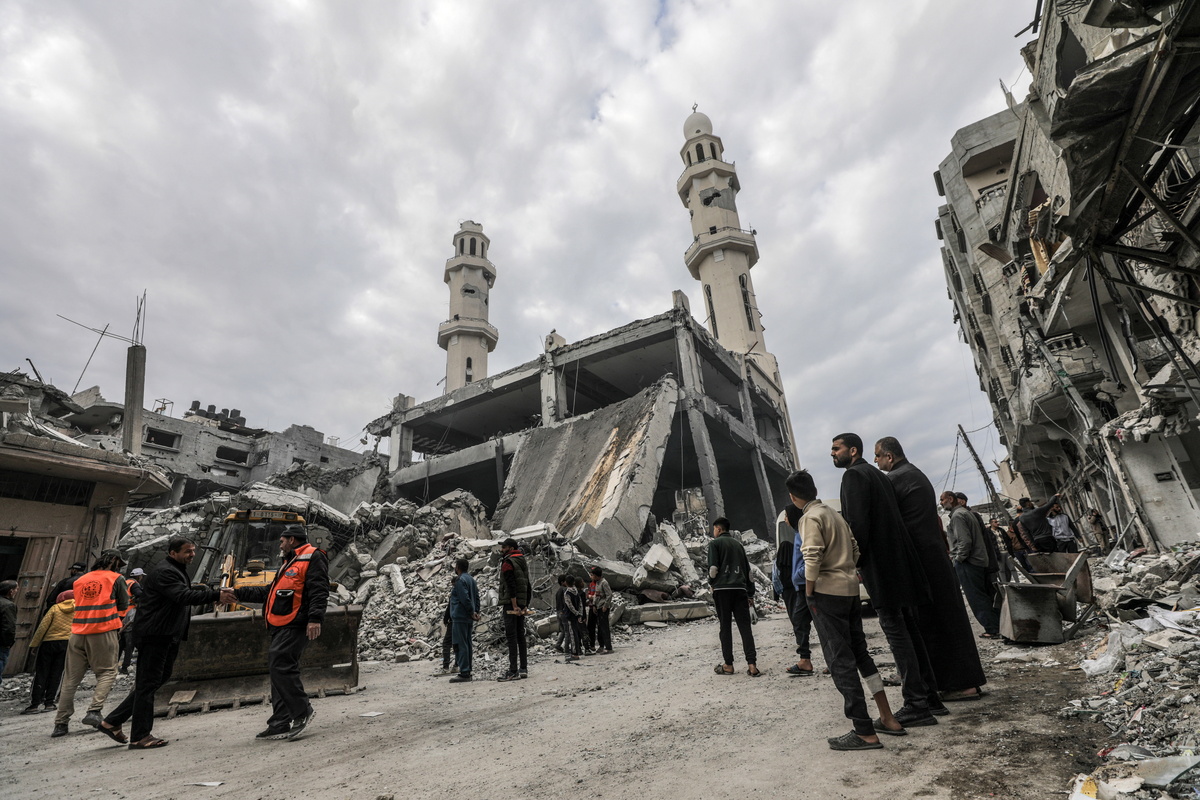epa11743808 Palestinians gather at the site of the Al-Qassam Mosque destroyed as a result of an overnight Israeli air strike on Al-Nuseirat refugee camp, in central Gaza Strip, 27 November 2024. More than 44,200 Palestinians and over 1,400 Israelis have been killed, according to the Palestinian Health Ministry and the Israeli Army, since Hamas militants launched an attack against Israel from the Gaza Strip on 07 October 2023, and the Israeli operations in Gaza and the West Bank which followed it. EPA/MOHAMMED SABER
