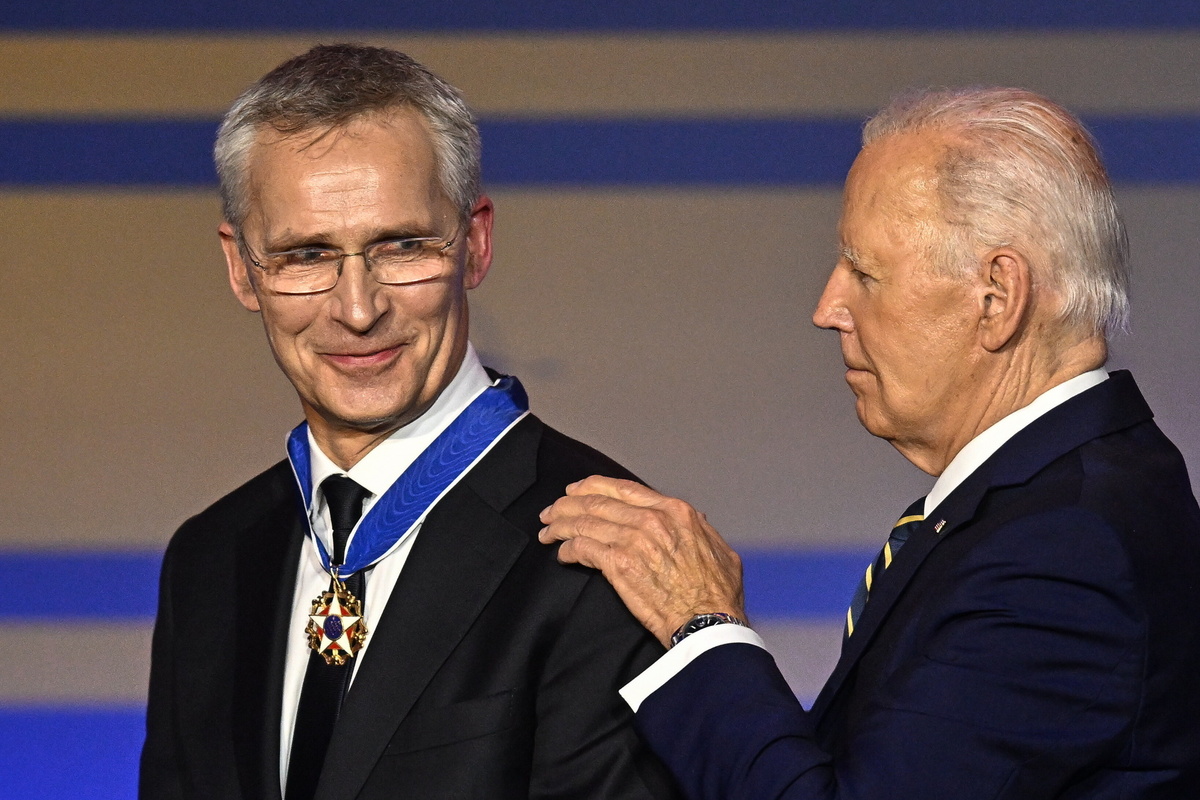 epa11469791 US President Joe Biden (R) awards the Presidential Medal of Freedom to NATO Secretary General Jens Stoltenberg (L) at the NATO 75th Anniversary ceremony at the Mellon Auditorium in Washington, DC, USA, 09 July 2024. The 75th Anniversary NATO Summit is taking place in Washington, DC from 09 to 11 July 2024. EPA/Radek Pietruszka POLAND OUT