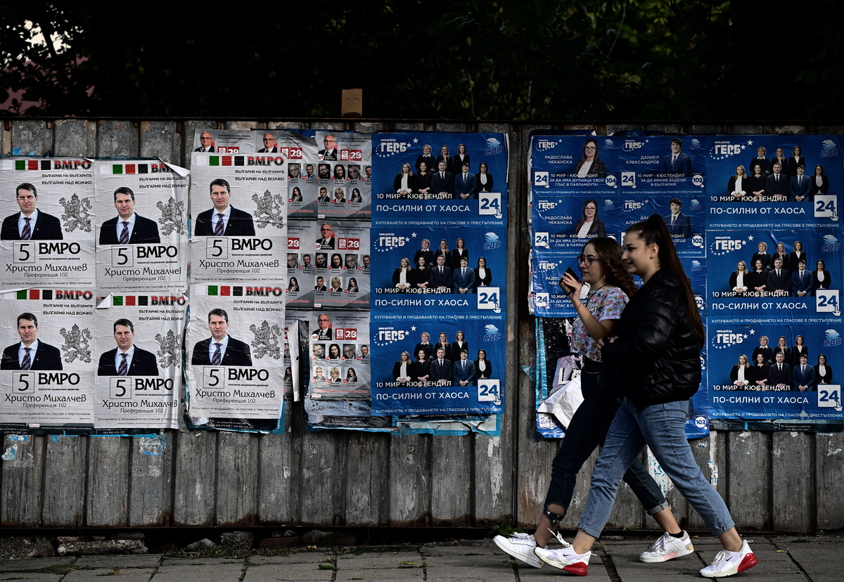 epa10213202 People walk past election posters in Dupnica, Bulgaria, 29 September 2022. The 2022 Bulgarian parliamentary election is scheduled for 02 November. EPA/VASSIL DONEV
