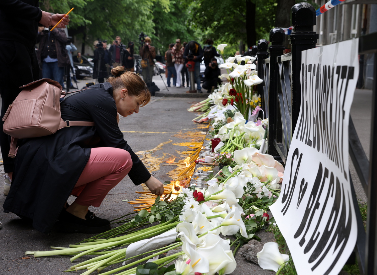 epa10607860 People leave flowers and light candles for the victims in front of the "Vladislav Ribnikar" elementary school in Belgrade, Serbia, 04 May 2023. A teenage student fatally shot seven girls and one boy using two handguns, which he had taken from his father. Six children and a teacher were also injured in the attack. EPA/ANDREJ CUKIC