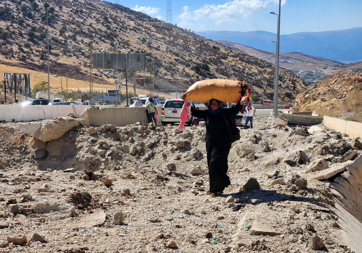 epa11641613 Displaced people carrying their belongings walk among debris past a shell crater near Lebanon's Masnaa border crossing with Syria, in Jdeidat Yabous, Syria, 04 October 2024. According to Syrian state news agency SANA, Israeli airstrikes targeted the international road leading to the Masnaa crossing, which caused it to be closed and car traffic to stop, but the entry of people from Lebanon to Syria continued through the Jdeidat Yabous crossing on the Syrian-Lebanese border. Israel's military stated on 04 October, that Israeli fighter jets struck an underground tunnel crossing from the Lebanese border into Syria on 03 October night, as part of their 'effort to prevent weapons from being smuggled' into Lebanese territories. The overnight strikes included infrastructure sites near the Masnaa border crossing, between Syria and Lebanon, the statement added. EPA/STRINGER