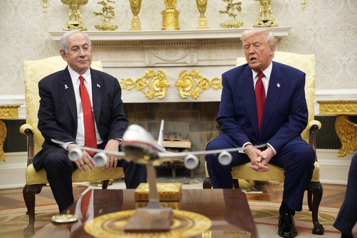 epa12016647 US President Donald Trump (R) meets with Israeli Prime Minister Benjamin Netanyahu (L) in the Oval Office of the White House in Washington, DC, USA, 07 April 2025. EPA/YURI GRIPAS / POOL
