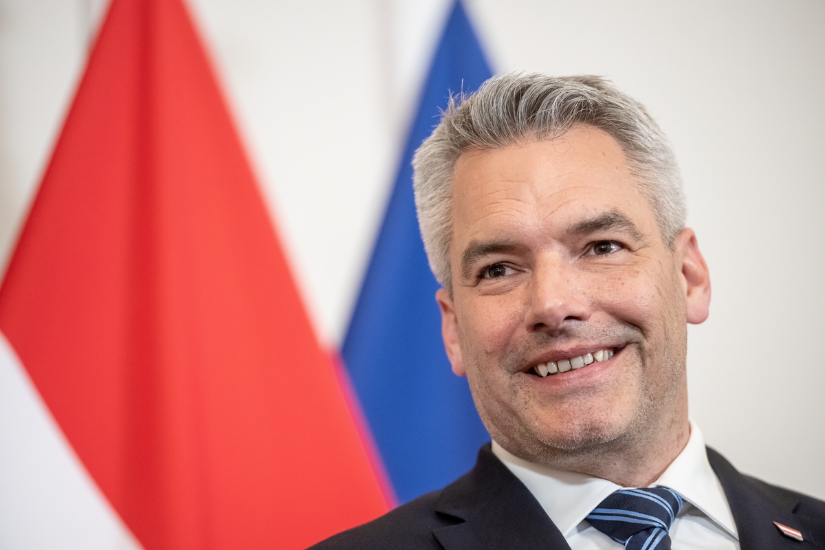 epa10615885 Austrian Chancellor Karl Nehammer speaks during a press conference with South Korean Prime Minister after a meeting at the Austrian Chancellery in Vienna, Austria, 08 May 2023. Han Duck-soo is on an official visit in Austria. EPA/CHRISTIAN BRUNA