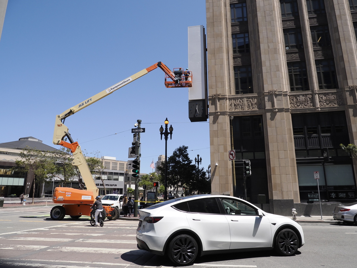 Οι αρμόδιες υπηρεσίες της πόλης επιβεβαίωσαν την αποξήλωση του φωτεινού ικριώματος του Έλον Μασκ και διευκρινίζουν ότι ο ιδιοκτήτης του κτιρίου πρέπει να πληρώσει τα έξοδα της άδειας κατασκευής που θα έπρεπε να έχει εκδώσει, καθώς και τα έξοδα της έρευνας για την εγκατάσταση της παράνομης κατασκευής.