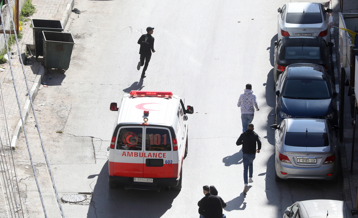 epa10556559 An ambulance car arrives during an Israeli operation in the West Bank City of Nablus, 03 April 2023. Two Palestinians were killed and 20 wounded during an Israeli army raid in Nablus city early Monday 03 April, Palestinian health Ministry said. EPA/ALAA BADARNEH