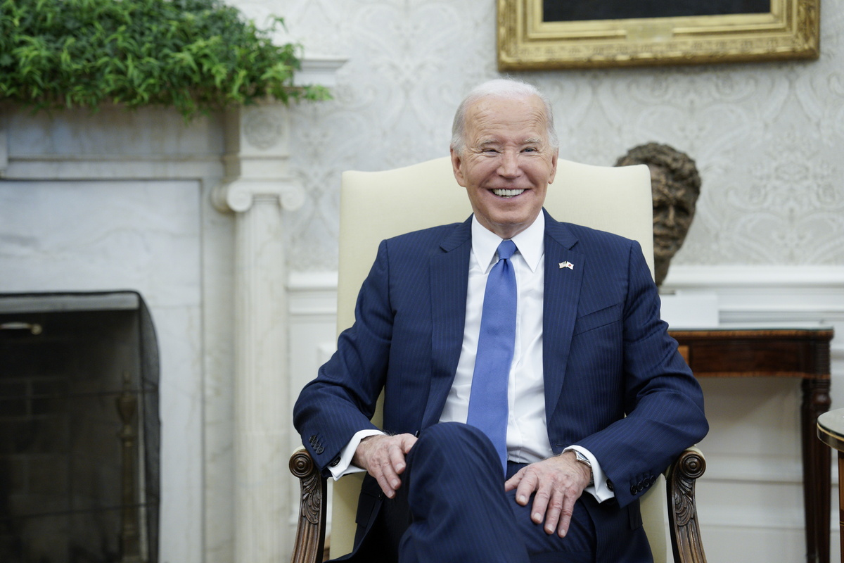 epa11270505 US President Joe Biden smiles as he meets with Japan's Prime Minister Fumio Kishida (not seen) in the Oval Office at the White House in Washington, DC, USA, 10 April 2024. Prime Minister Fumio Kishida of Japan is making the first State visit to the White House of a Japanese prime minister in nine years. EPA/YURI GRIPAS / POOL