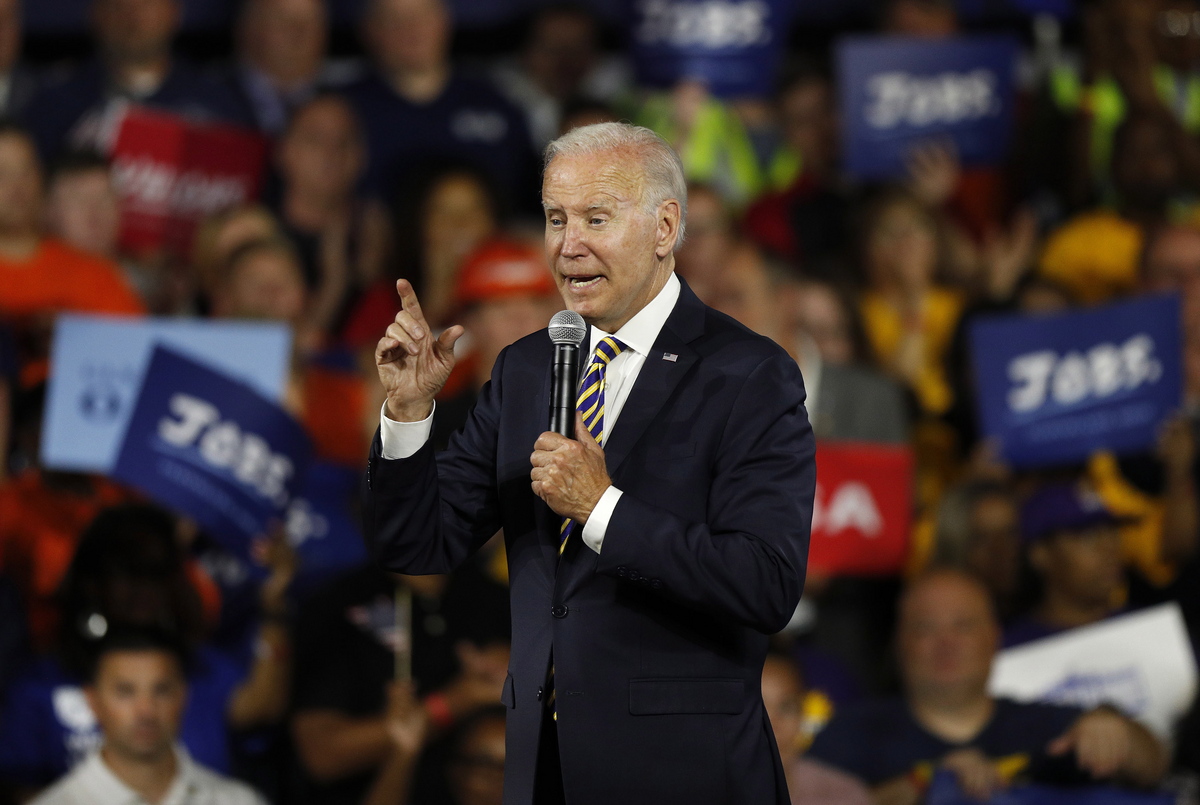 epa10056014 US President Joe Biden speaks during a visit to Max S. Hayes High School in Cleveland, Ohio to discuss details of his American Rescue Plan fix for troubled multi-employer pension plans, in Cleveland, Ohio, USA, 06 July 2022. EPA/DAVID MAXWELL