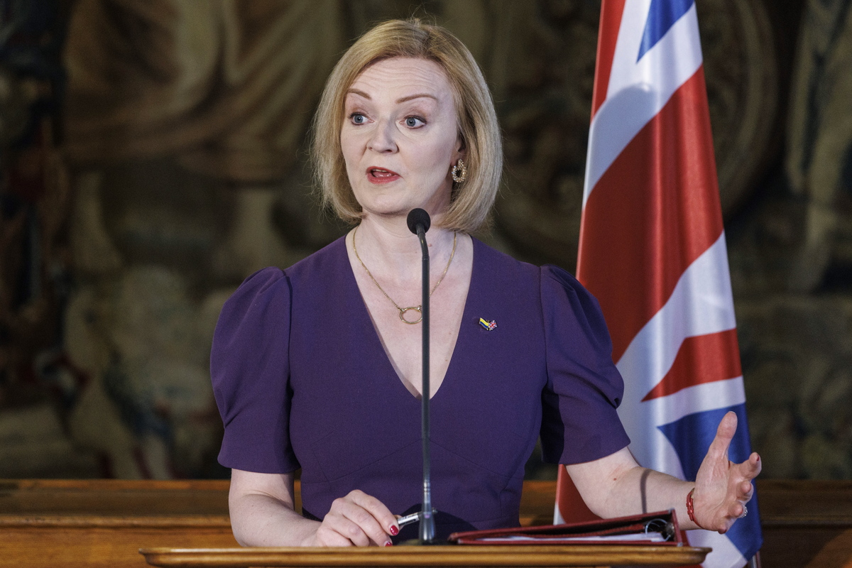 epa09979640 British Foreign Secretary Liz Truss addresses a joint press conference following a meeting with Czech Foreign Minister Jan Lipavsky , at the Czernin Palace in Prague, Czech Republic, 27 May 2022. EPA/MILAN JAROS