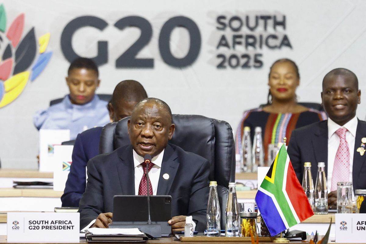 epa12541329 South African President Cyril Ramaphosa delivers opening remarks, welcoming leaders and outlining summit priorities on the first day of the G20 Summit at the Nasrec Expo Centre in Johannesburg, South Africa, 22 November 2025. World leaders are gathering in South Africa, the host of this year's G20 Leaders' Summit on 22 and 23 November 2025, to discuss the global economy, development and financing. EPA/THOMAS MUKOYA / POOL
