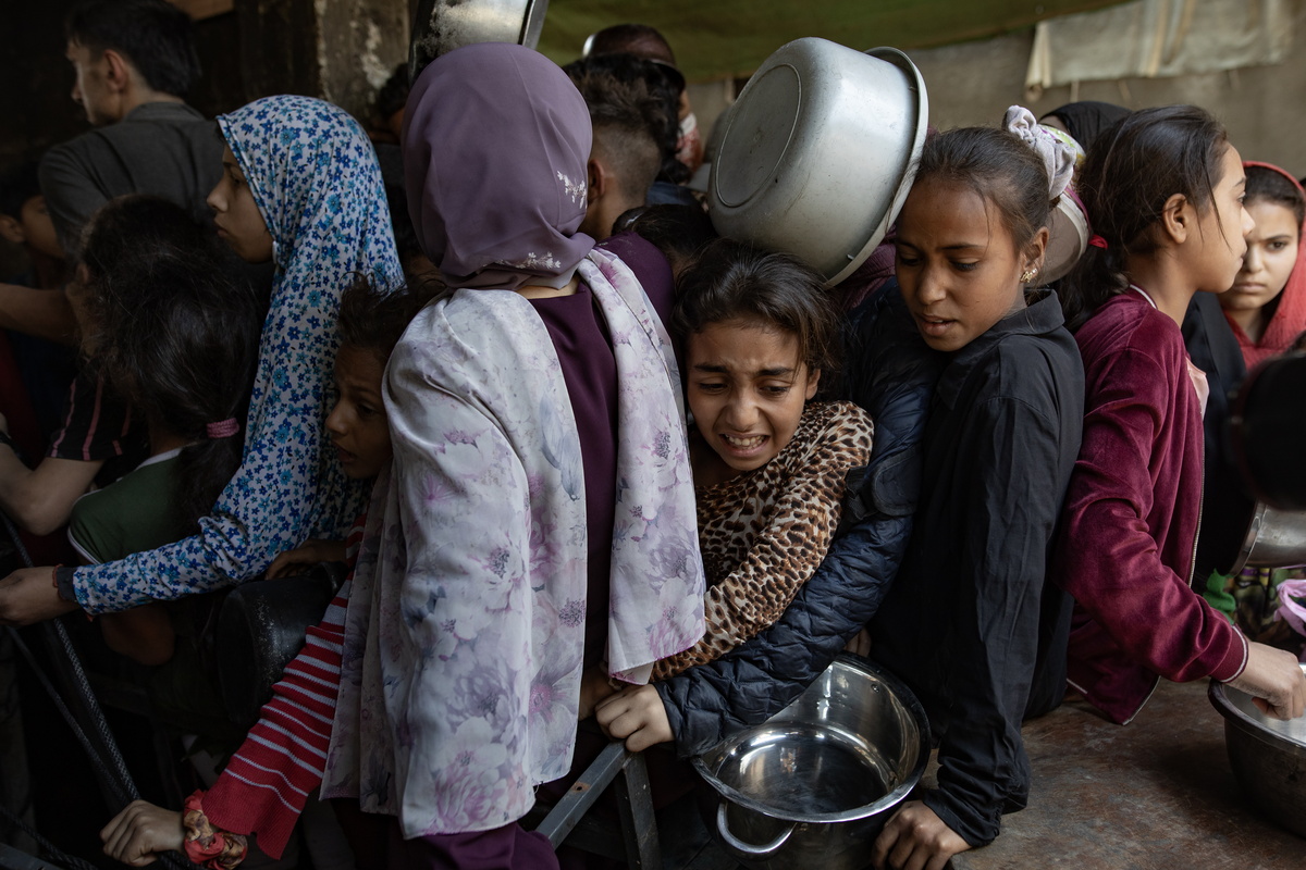 epa12122619 Hundreds of displaced Palestinians gather outside the Sokar Charity Kitchen in Gaza City to receive limited food rations,21 May, 2025. Kitchen officials say their stocks ran out today due to the suspension of humanitarian aid entering the Gaza Strip. EPA/HAITHAM IMAD