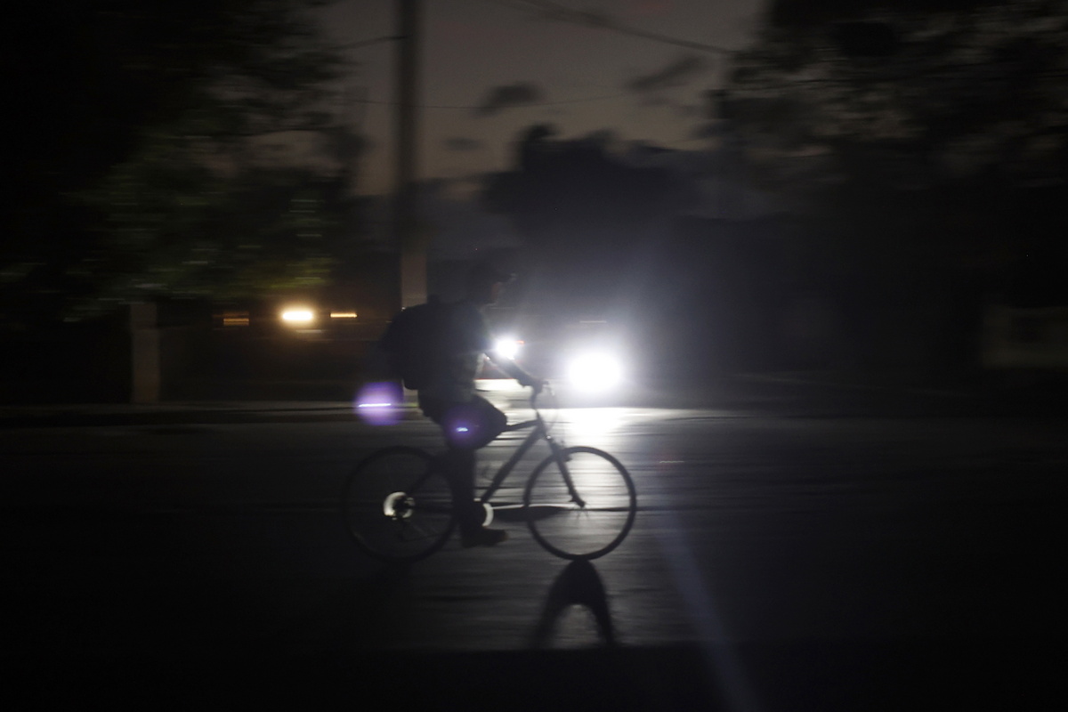 epa12795900 A person rides a bicycle during a power outage in Havana, Cuba, 04 March 2026. About six million Cubans were left without power after a breakdown at a key power plant caused the National Electric System (SEN) to fail in two-thirds of the country, including Havana, according to the state-owned Electric Union (UNE). EPA/ERNESTO MASTRASCUSA