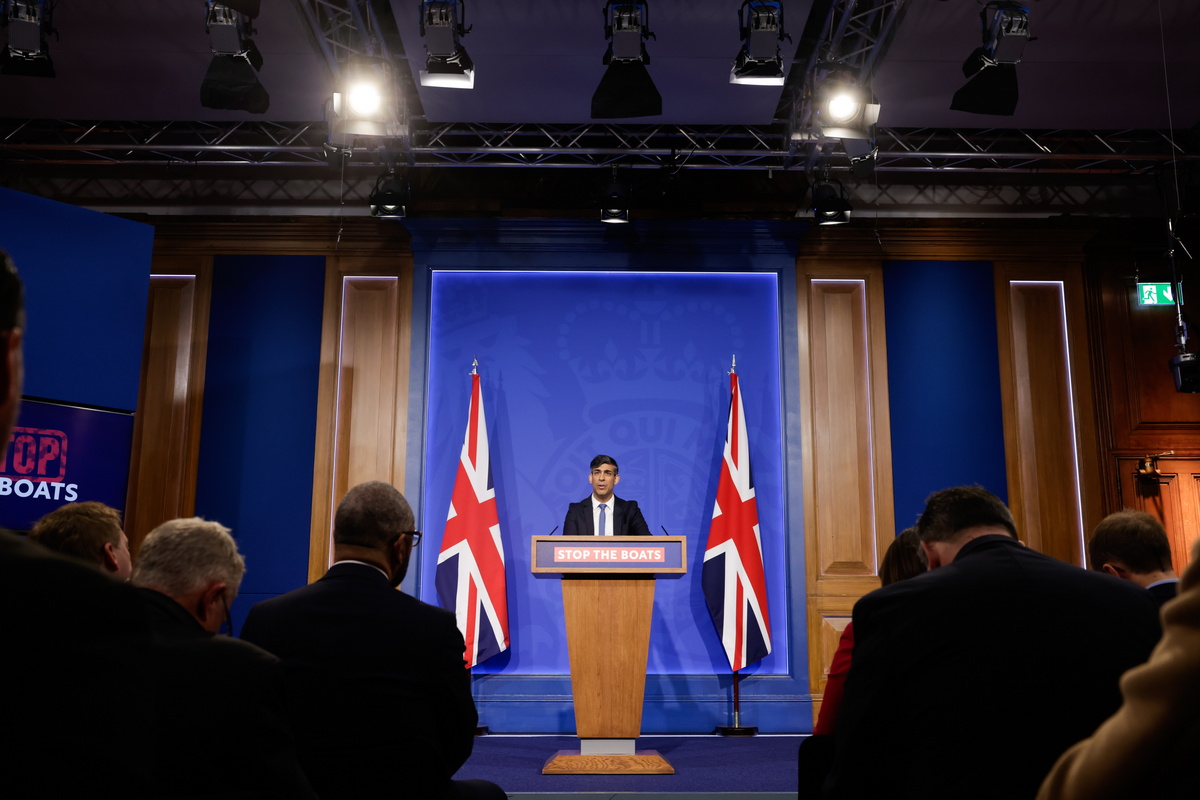 epa11293485 British Prime Minister Rishi Sunak speaks during a news conference on his flagship Rwanda migration policy, in London, Britain, 22 April 2024. Sunak seeks to push a bill through the Parliament that enables his flagship migration policy as the British prime minister seeks to regain momentum 10 days from a crucial set of local elections. EPA/JASON ALDEN / POOL