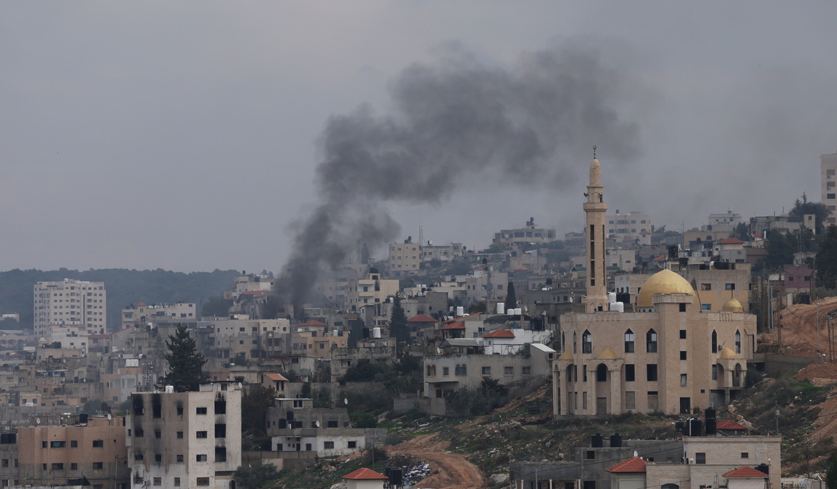 epa11849466 Smoke rises on the fourth day of an Israeli military operation in the West Bank city of Jenin, 24 January 2025. The Israeli military launched a 'counterterrorism operation' in Jenin on 21 January 2025, resulting in at least 12 Palestinian deaths and more than 50 injuries, according to the Palestinian Ministry of Health. EPA/ALAA BADARNEH