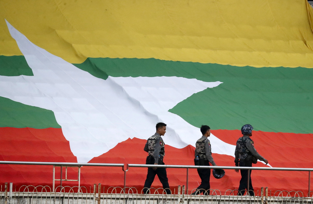 epa10987635 Myanmar police officers walk in front of the Myanmar national flag during the 2026 FIFA World Cup qualification soccer match between Myanmar and North Korea in Yangon, Myanmar, 21 November 2023. EPA/NYEIN CHAN NAING