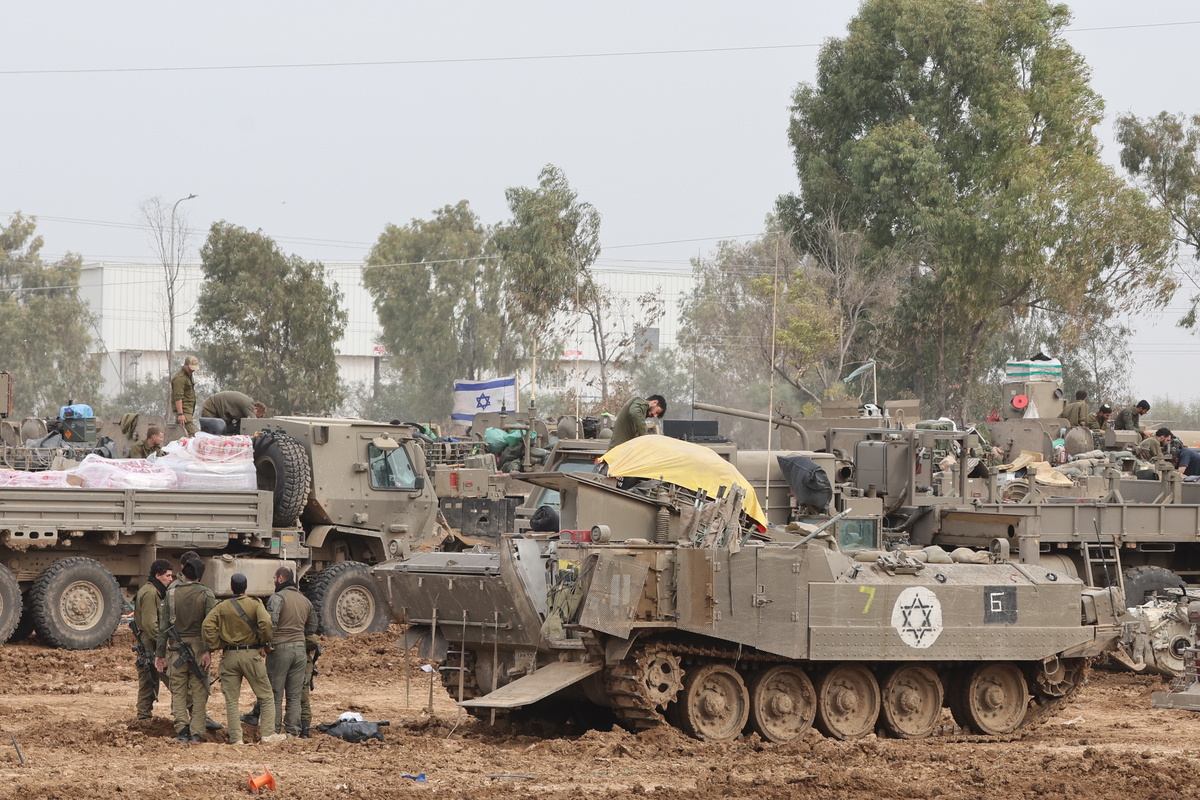 epa11039701 Israeli soldiers prepare their armored personnel carriers (APC) at their position near the Gaza Strip border, in southern Israel, 21 December 2023. More than 19,600 Palestinians and at least 1,200 Israelis have been killed, according to the Palestinian Health Ministry and the Israel Defense Forces (IDF), since Hamas militants launched an attack against Israel from the Gaza Strip on 07 October, and the Israeli operations in Gaza and the West Bank which followed it. EPA/ABIR SULTAN