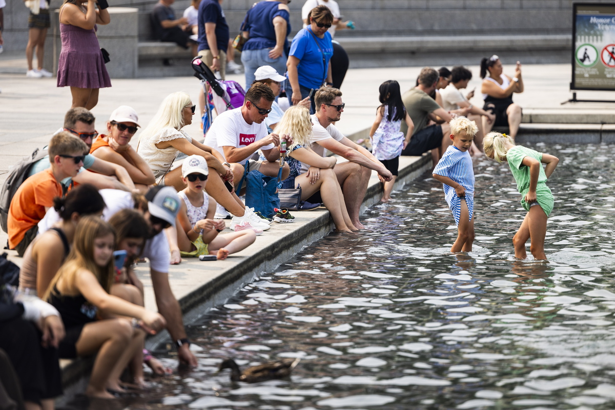 epa10752204 Visitors to the World War II Memorial cool off by the memorial's pool during hot, humid weather in Washington, DC, USA, 17 July 2023. With a historic heat wave gripping much of Europe and the US, Washington DC is experiencing temperatures in the 90s with a heat index of 95 degrees Fahrenheit (35 Celsius). EPA/JIM LO SCALZO