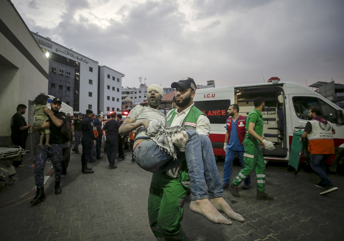 epa10908887 A Palestinian rescuer carries a wounded person at Al-Shifa hospital in Gaza City, 09 October 2023. The Israeli army announced on 09 October, it carried out over 500 strikes on targets across the Gaza Strip overnight. Palestinian officials said almost 500 people were killed, including 91 children, and over 2,700 were injured after Israel launched retaliatory raids and air strikes in the Palestinian enclave. An unprecedented attack on southern Israel on 07 October claimed by the Islamist movement Hamas killed more than 700 Israelis and left over 2,150 injured, the Israeli army said. EPA/HAITHAM IMAD