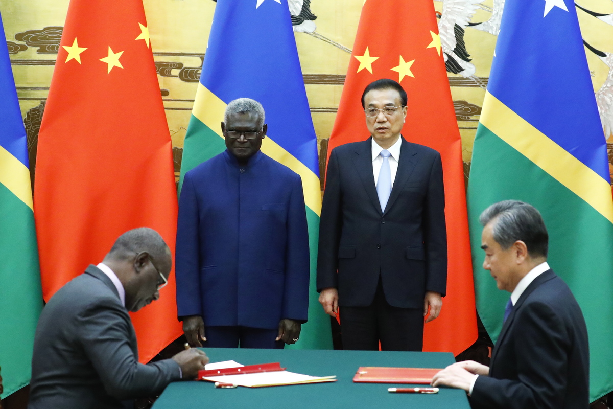epa07906551 (L-R) Solomon Islands Foreign Minister Jeremiah Manele, Solomon Islands Prime Minister Manasseh Sogavare, Chinese Premier Li Keqiang and Chinese State Councillor and Foreign Minister Wang Yi attend a signing ceremony at the Great Hall of the People in Beijing, China, 09 October 2019. EPA/THOMAS PETER / POOL