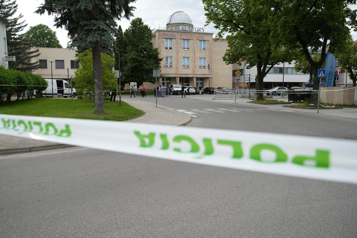 epa11342342 A view of the cordoned-off crime scene where Slovak Prime Minister Robert Fico was shot earlier in the day, in Handlova, Slovakia, 15 May 2024. According to a statement from the Slovak government office on 15 May, "following a government meeting in Handlova, there was an assassination attempt on the Prime Minister of the Slovak Republic Robert Fico. He is currently being transported by helicopter to Banska Bystrica Hospital in a life-threatening condition." EPA/JAKUB GAVLAK