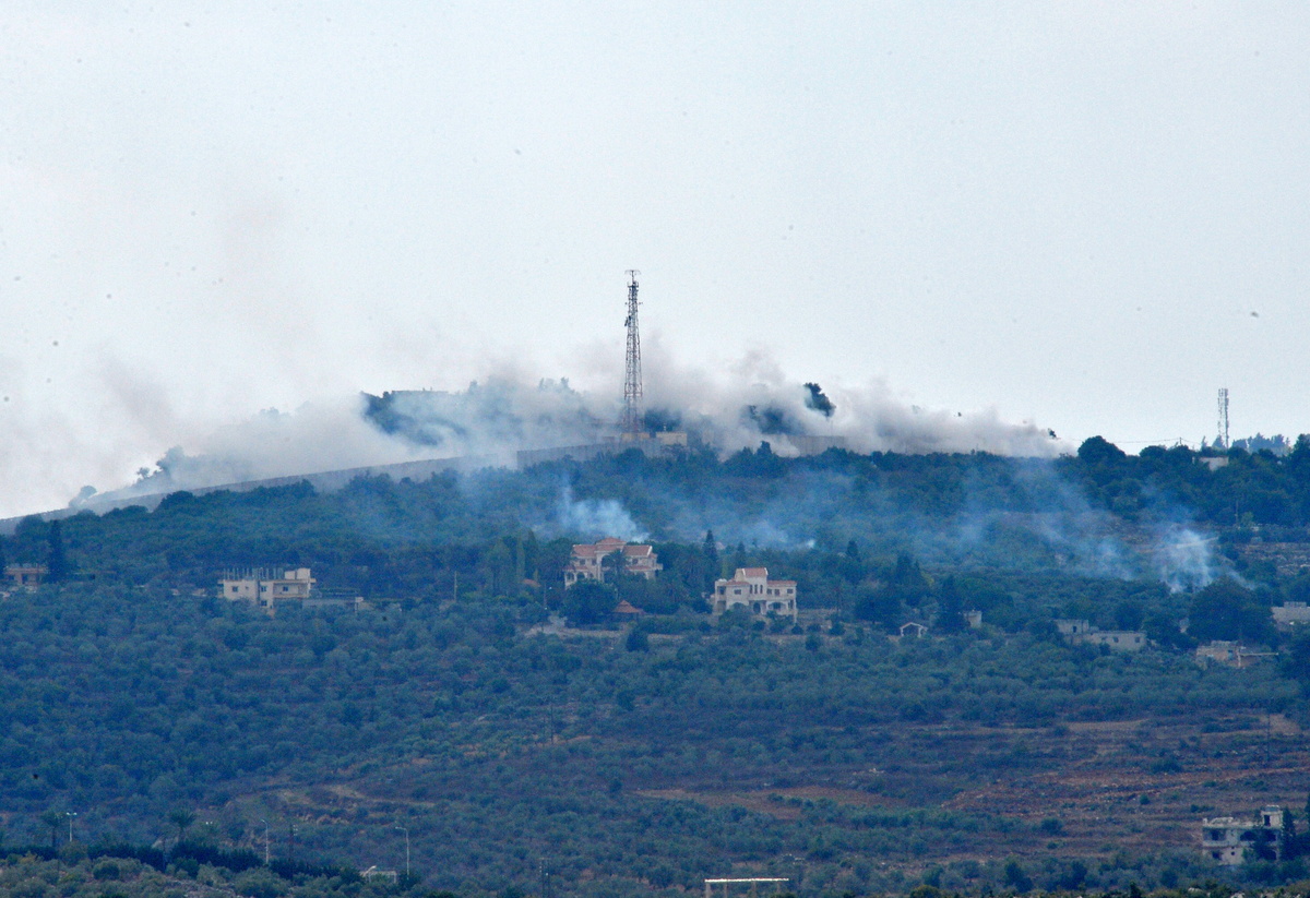 epa10913224 Smoke rises from positions on a hill after Israeli shelling on the outskirts of Dhayra village, near the Lebanese-Israeli border, Lebanon, 11 October 2023. Hezbollah said on 11 October it fired missiles on Israel, two days after three of its members were killed in border towns. The Israel Defence Forces (IDF) said an anti-tank missile was launched from Lebanon toward a military post adjacent to the community of Arab Al-Aramshe on the BlueLine, and it responded by shelling Southern Lebanese towns. EPA/WAEL HAMZEH