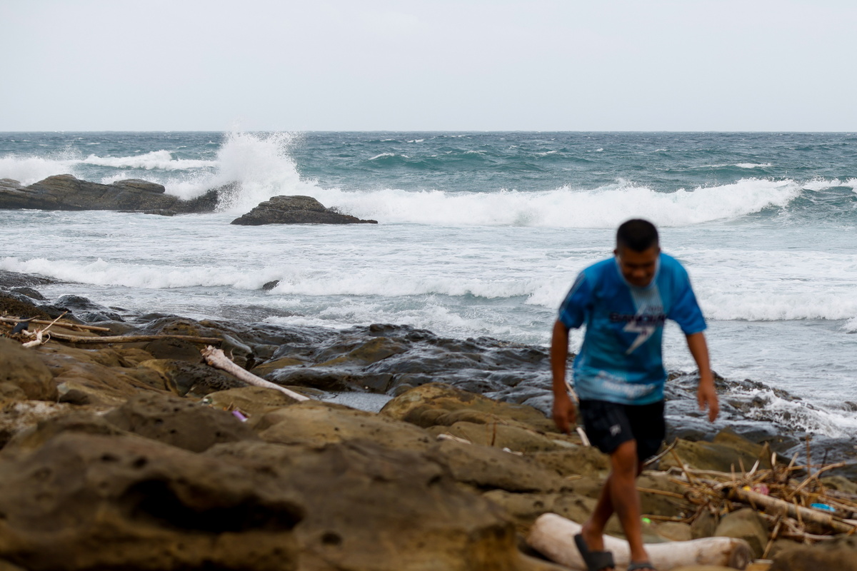 epa12397212 A person walks in front of waves brought by Super Typhoon Ragasa in New Taipei City, Taiwan, 22 September 2025. As of 3 p.m. on 22 September, Typhoon Ragasa was 290 kilometers south-southeast of Cape Eluanbi, moving west-northwest at 21 kilometers per hour with winds of 209 kilometers per hour. It reached the Hengchun Peninsula by 11 a.m. and is expected to peak and pass closest to Taiwan from 22 September afternoon to 23 September. Warnings cover Kaohsiung, Taitung, Pingtung, and the surrounding waters. The main island could exit the storm circle by midday 23 September, with warnings, with warnings expected to lift later. EPA/RITCHIE B. TONGO