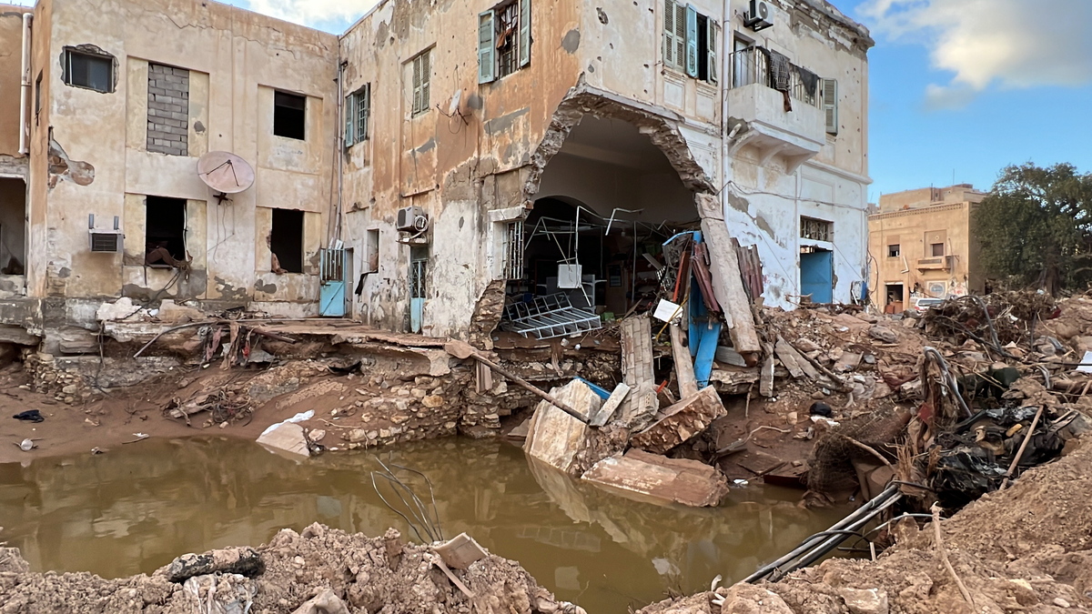 epa10868434 A damaged building, days after Storm Daniel swept across eastern Libya, in the port city of Derna, Libya, 18 September 2023. Intense rainfall from the storm in the country's eastern region caused the collapse of two dams south of the city of Derna, sweeping away entire neighborhoods. The death toll has surpassed 11,300 and over 34,000 people have been displaced across the country. The flooding exacerbated Libya's needs, where 800,000 people are reported in need of humanitarian assistance, the International Rescue Committee (IRC) said. EPA/STR