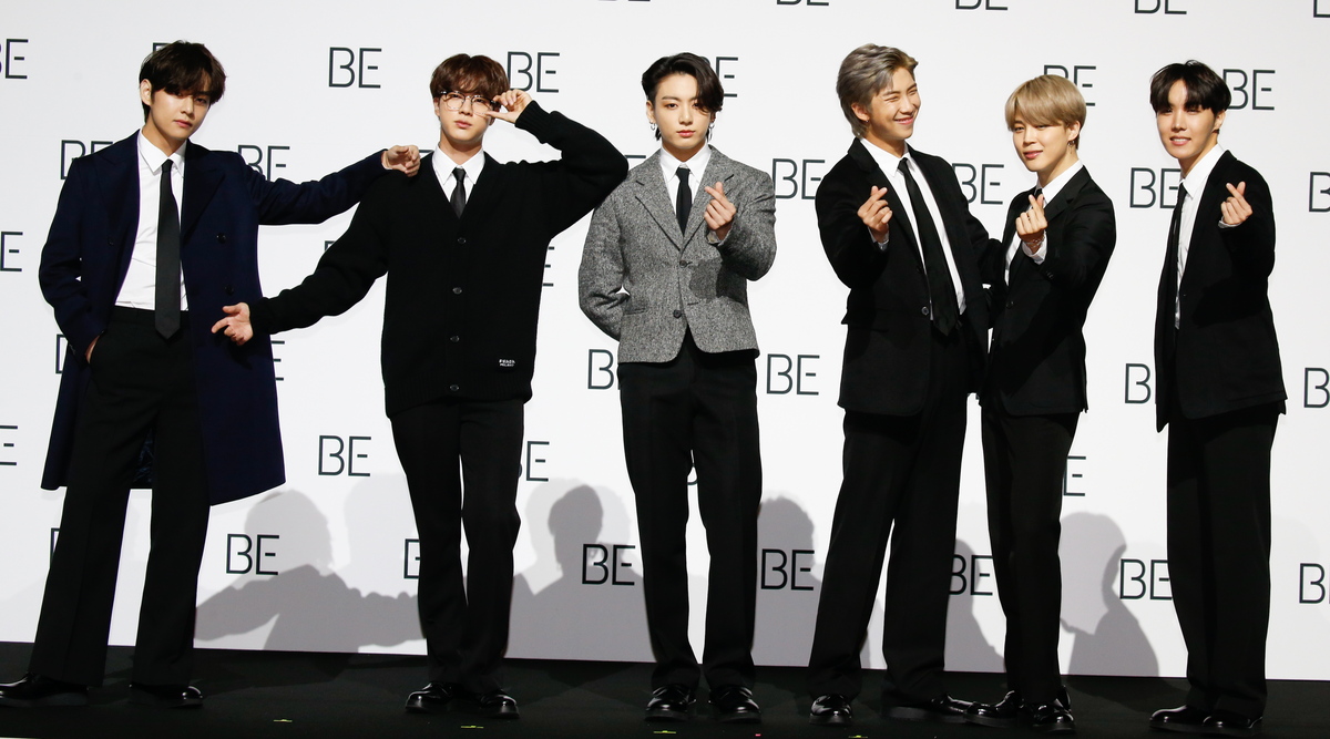 epa08854175 Members of South Korean boy band 'Bangtan Boys, BTS' V (L), Jin (2-L), Jung Kook (3-L), RM (3-R), Jimin (2-R) and J-hope (R), pose as they arrive for their album launch at Dongdaemun Design Plaza (DDP) in Seoul, South Korea, 20 November 2020 (reissued 01 December 2020). Media reports on 01 December said that South Korea's National Assembly has revised the country’s Military Service Act to allow BTS' oldest member Jin (28), whose full name is Kim Seok-Jin, to postpone his military service until the age of 30. The law so far saw Korean men to serve in the military for about 20 months once they turn 28 or before. EPA/KIM HEE-CHUL