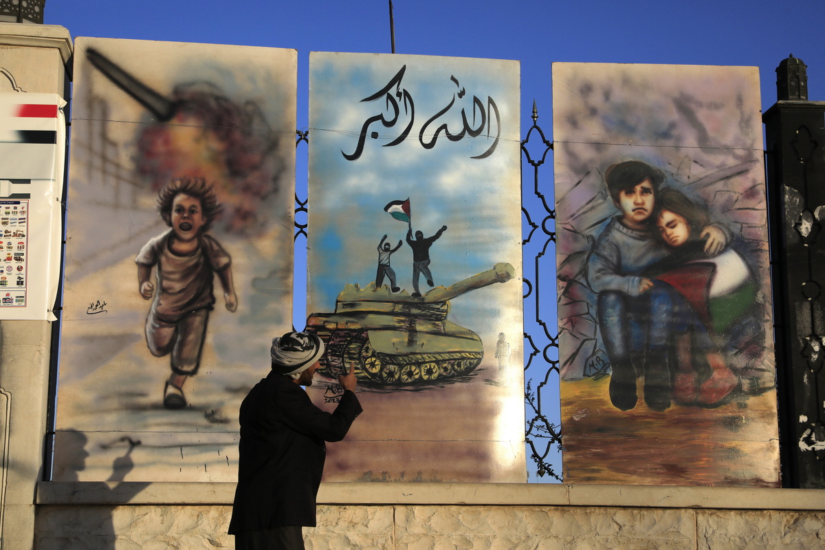 epa11099219 A person looks at artworks on display on a fence as part of an outdoor art exhibition in solidarity with the Palestinian people, in Sana'a, Yemen, 23 January 2024. According to a statement by Houthis' military spokesman Yahya Sarea, the US and UK forces launched 18 new strikes against Houthi military positions in Yemen in response to increased Houthi activities in the Red Sea and the Gulf of Aden. The Houthis have vowed to keep up attacks on ships in the Red Sea and the Gulf of Aden, with the aim of ending the Israeli bombardment of the Gaza Strip, and in response to US-led retaliatory strikes. The US Department of State on 17 January announced the designation of Yemen's Houthis as a 'Specially Designated Global Terrorist group' amid an escalation of their attacks on shipping lanes in the Red Sea, the Bab al-Mandab Strait, and the Gulf of Aden since November 2023. The US Department of Defense announced in December 2023 a multinational operation to safeguard trade and protect ships in the Red Sea amid the escalation in Houthi attacks. EPA/YAHYA ARHAB