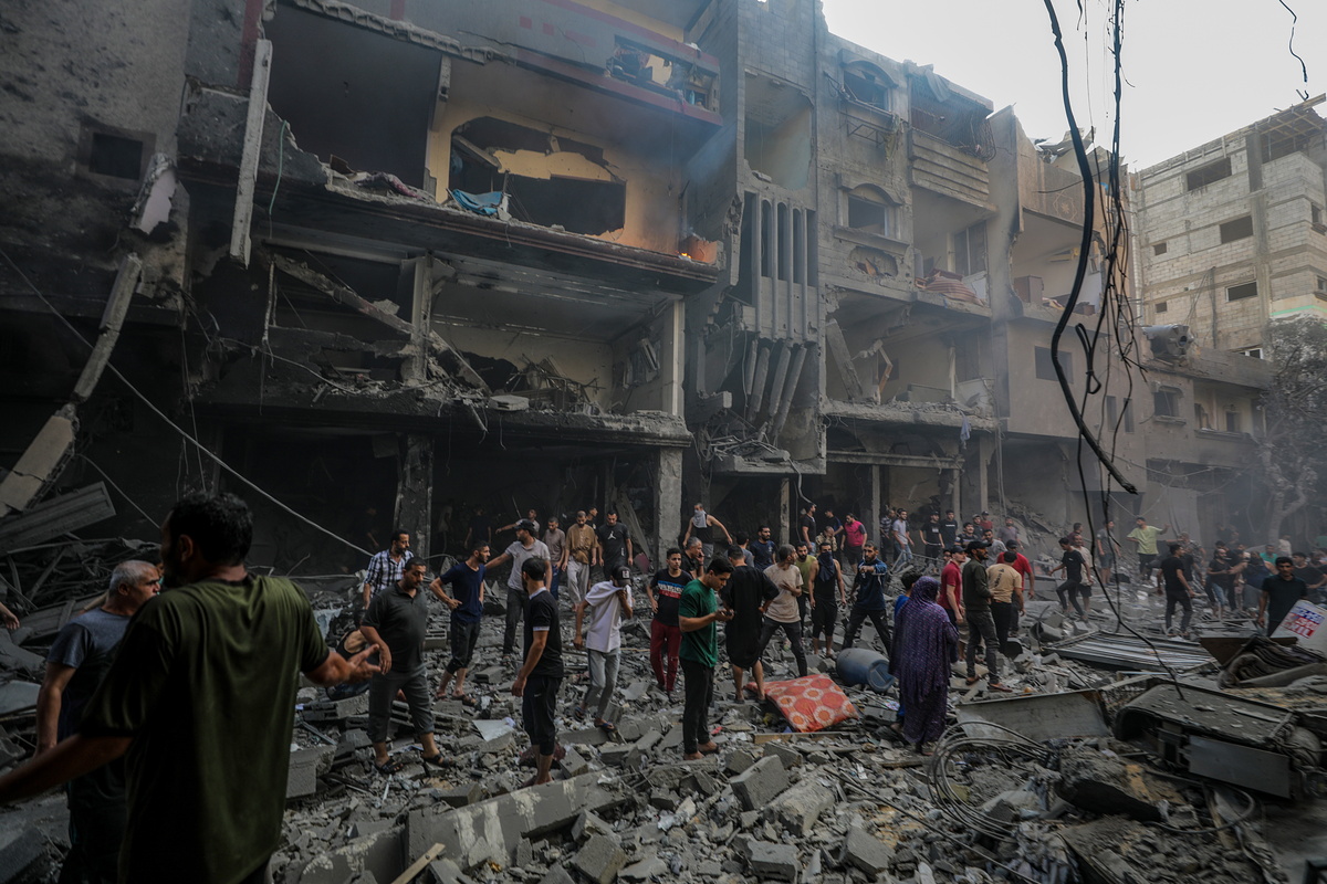 epa10919143 People search for survivors at the site of an Israeli rocket attack in Al-Shati refugee camp in the west of Gaza City on, 14 October 2023. The Israeli Defense Force (IDF) on 13 October called for the evacuation of all civilians of northern Gaza ahead of an expected ground invasion. More than 1,300 Israelis have been killed and over 3,200 others injured, according to the IDF, after the Islamist movement Hamas launched an attack against Israel from the Gaza Strip on 07 October. More than 2,000 Palestinians have been killed and over 8,700 others injured in Gaza since Israel launched retaliatory air strikes, the Palestinian health ministry said. EPA/MOHAMMED SABER