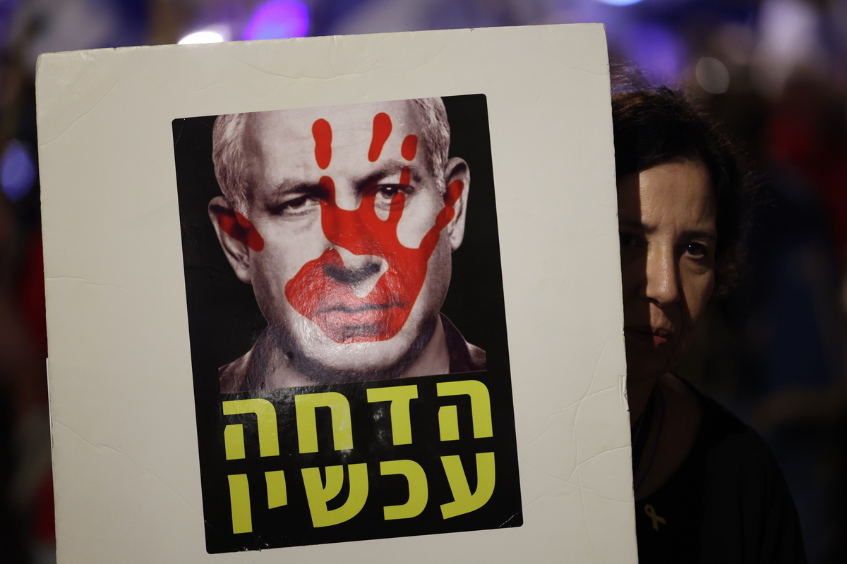 epa11580530 A protester supporting the families of Israeli hostages held by Hamas in Gaza, holding a sign reading 'impeachment now' outside the residence of Prime Minister Benjamin Netanyahu in Jerusalem, 02 September 2024. Israel's largest labour union, Histadrut, called for a nationwide general strike to start on 02 September urging the Israeli Prime Minister to reach a deal to secure the remaining hostages held by Hamas following the 07 October attack. Thousands of Israelis protested across Israel on 01 September following the recovery of the bodies of six hostagres held by Hamas in the Gaza Strip. According to a statement by the Israeli Government Press Office, 97 Israeli hostages remain in captivity in the Gaza Strip, with 33 confirmed dead. EPA/ABIR SULTAN