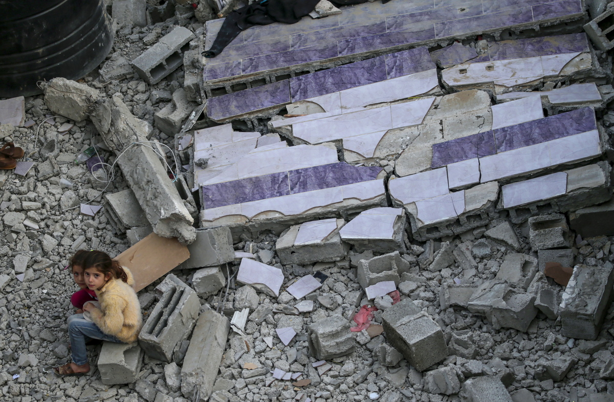 epa10628570 Two Palestinian sisters from the Abu-Nabhan family sit near the rubble of their destroyed family house, following Israeli strikes in Jabaliya town, northern Gaza Strip, 14 May 2023. Israel and Islamic Jihad movement agreed to an Egyptian-brokered truce late 14 May. Israel has carried out several attacks against the military leadership of the Palestinian Islamic Jihad movement, in retaliation to rockets being fired towards Israel from in the Gaza Strip. EPA/MOHAMMED SABER