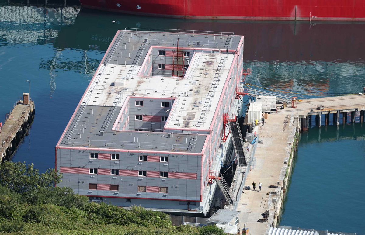 epa10757465 The Bibby Stockholm barge lies in Portland Port in Dorset in Britain, 20 July 2023. The converted barge will house migrants for up to 18 months. The vessel is over 93 meters long and can house 506 people. Bibby Stockholm is the first vessel secured under Home Secretary Suella Braverman's plans to reduce the cost of asylum accommodation. EPA/NEIL HALL
