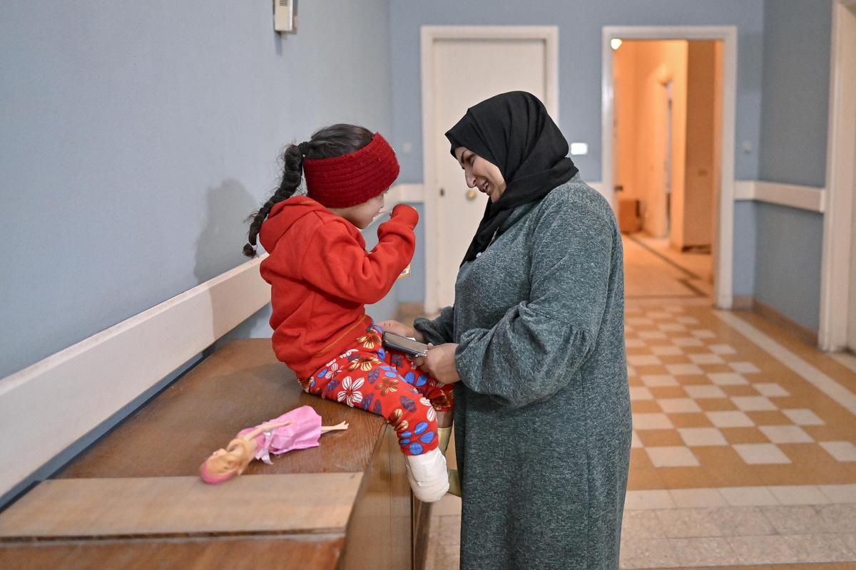 epa11140397 A 5-year-old Palestinian girl with an amputated leg talks to her aunt (her parents were killed) in the Italian Umberto I hospital in Cairo, Egypt, 09 February 2024, before the boarding of Italian Air Force C130 aircraft with injured or seriously ill Palestinian children and young people on board, accompanied by about fifteen family members, during a mission of the crisis unit of the Ministry of Foreign Affairs together with healthcare and military personnel to take them for treatment in Italy. EPA/ALESSANDRO DI MEO