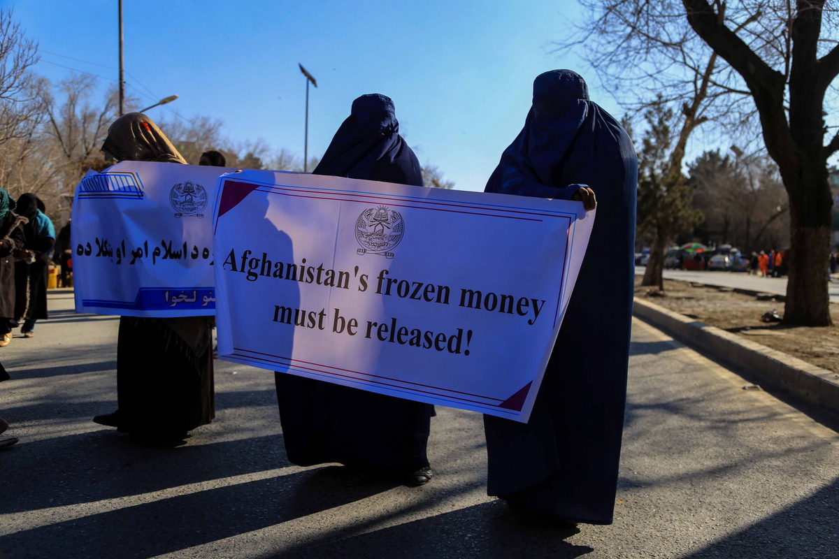 epa09710602 Afghan women carry placards during a rally demanding from the US and international community to unfreeze the country's assets, during a protest outside the former US embassy, in Kabul, Afghanistan, 26 January 2022. The Taliban government has issued an open letter to the United States Congress asking it to end sanctions against Afghanistan, resume the flow of aid and unfreeze assets in Afghan banks, in the view of the ongoing crisis in the country. Afghanistan has been experiencing a severe humanitarian crisis as people have no job or income and many were forced to sell their belongings for food. Banks have resumed operations with limited cash flow. EPA/STRINGER