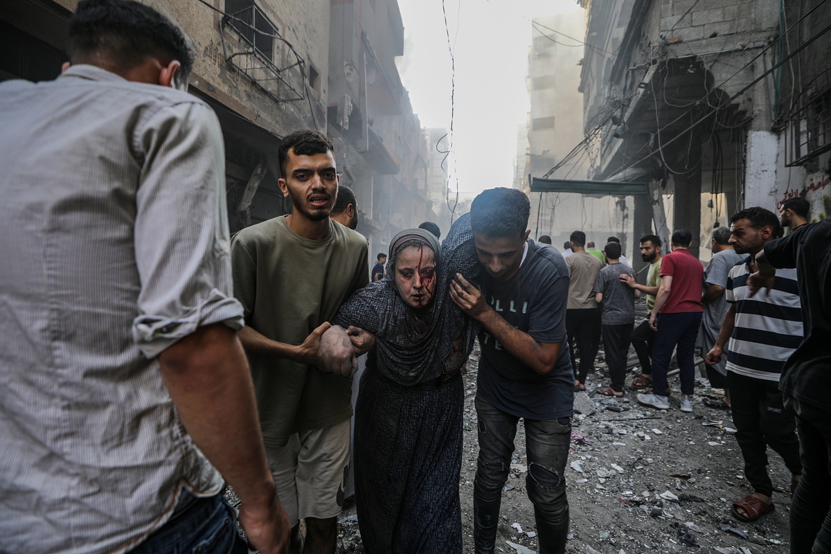 epa10919122 An injured woman is helped away from the site of an Israeli rocket attack in Al- Shati refugee camp in the west of Gaza City on, 14 October 2023. The Israeli Defense Force (IDF) on 13 October called for the evacuation of all civilians of northern Gaza ahead of an expected ground invasion. More than 1,300 Israelis have been killed and over 3,200 others injured, according to the IDF, after the Islamist movement Hamas launched an attack against Israel from the Gaza Strip on 07 October. More than 2,000 Palestinians have been killed and over 8,700 others injured in Gaza since Israel launched retaliatory air strikes, the Palestinian health ministry said. EPA/MOHAMMED SABER