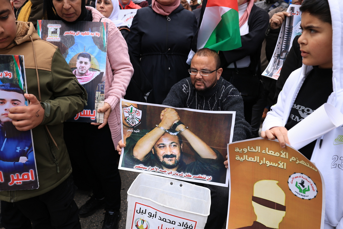 epa11184273 Palestinians hold pictures of their relatives held in Israeli jails during a protest in solidarity with Palestinian prisoners and against the ongoing conflict in Gaza, in the West Bank city of Nablus, 27 February 2024. EPA/ALAA BADARNEH