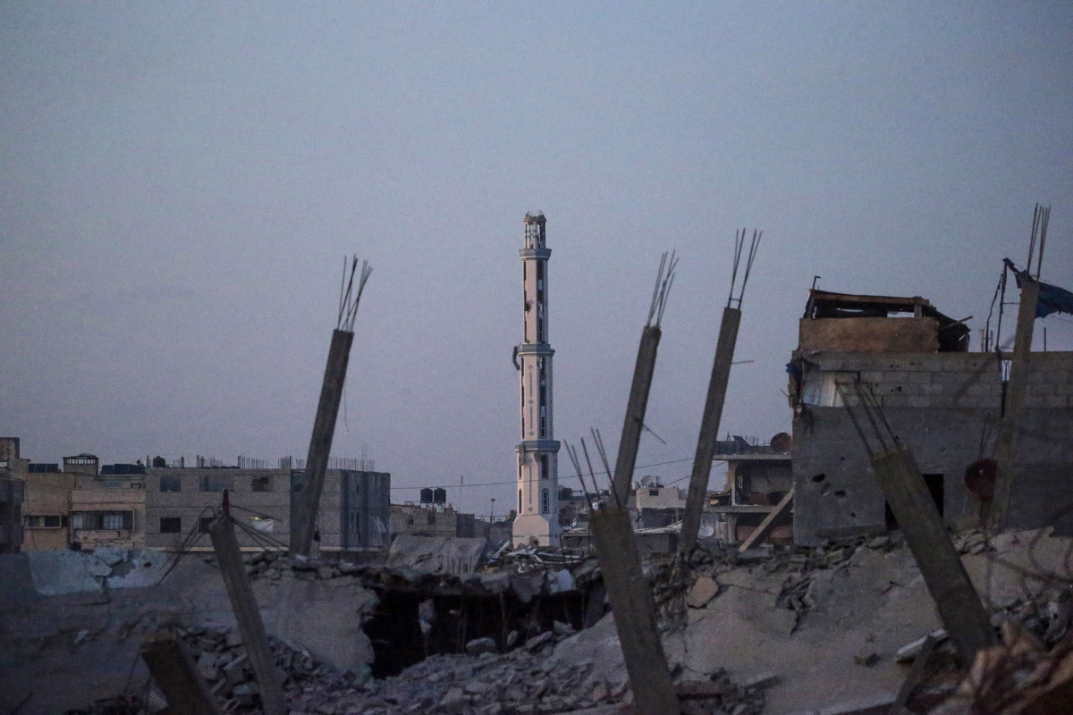 epaselect epa11383129 Destroyed buildings in Khan Younis town, southern Gaza Strip, 31 May 2024 (issued 01 June 2024). The makeshift camp for internally displaced Palestinians previously located in the area was dismantled by Palestinians following an evacuation order by Israeli forces. The International Court of Justice (ICJ) on 24 May ordered Israel to halt its military operation in Rafah, to open the Rafah border crossing with Egypt to allow for the entry of humanitarian aid, to allow access to Gaza for investigators, and to report to the court within one month on its progress. More than 36,000 Palestinians and over 1,400 Israelis have been killed, according to the Palestinian Health Ministry and the Israel Defense Forces (IDF), since Hamas militants launched an attack against Israel from the Gaza Strip on 07 October 2023, and the Israeli operations in Gaza and the West Bank which followed it. EPA/MOHAMMED SABER