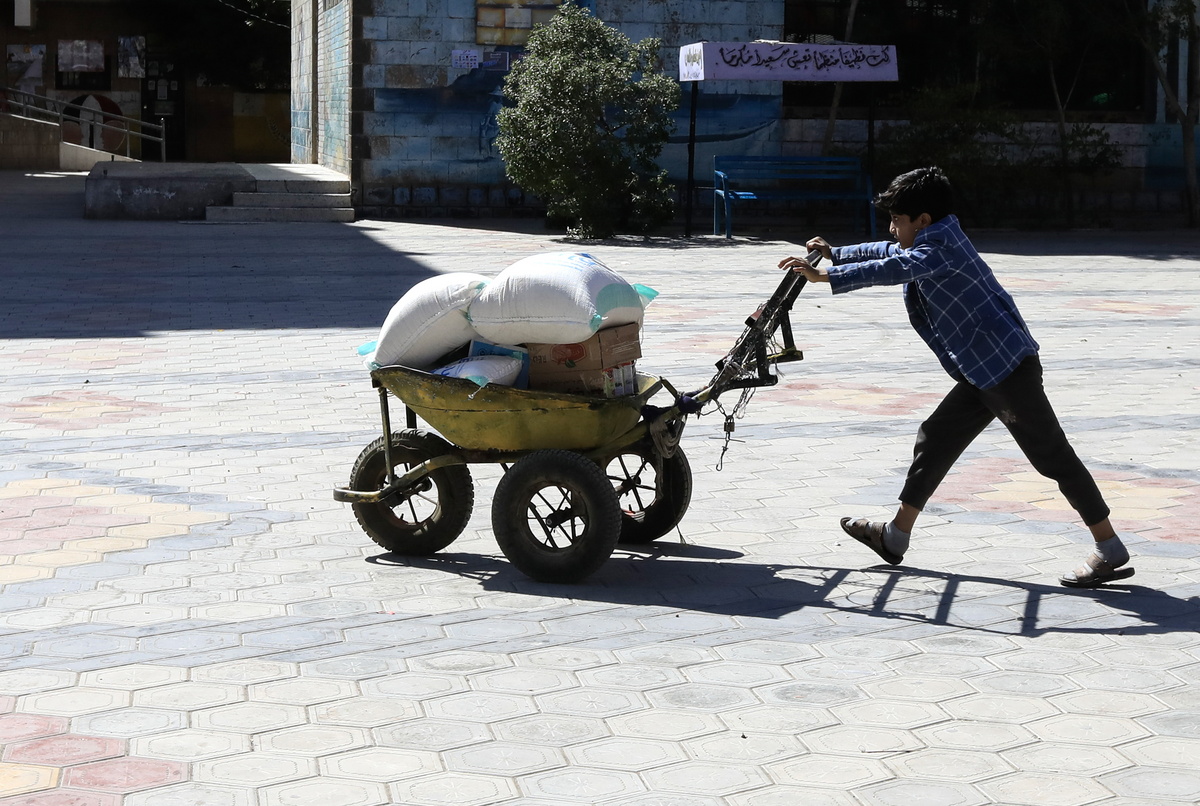 epaselect epa11004004 A Yemeni boy pushes a wheelbarrow with his family's food aid, amid acute food insecurity, in Sana'a, Yemen, 30 November 2023. The World Food Programme (WFP) has halted its food assistance to 4.4 million people out of 13 million beneficiaries in Yemen, following phased reductions over the past few months, due to a funding crisis for its programs, according to a statement by the Houthis political council. War-ravaged Yemen is experiencing one of the worst humanitarian crises in the world, with 80 percent of its 30 million-population in dire need of humanitarian aid, according to estimates by the United Nations. EPA/YAHYA ARHAB